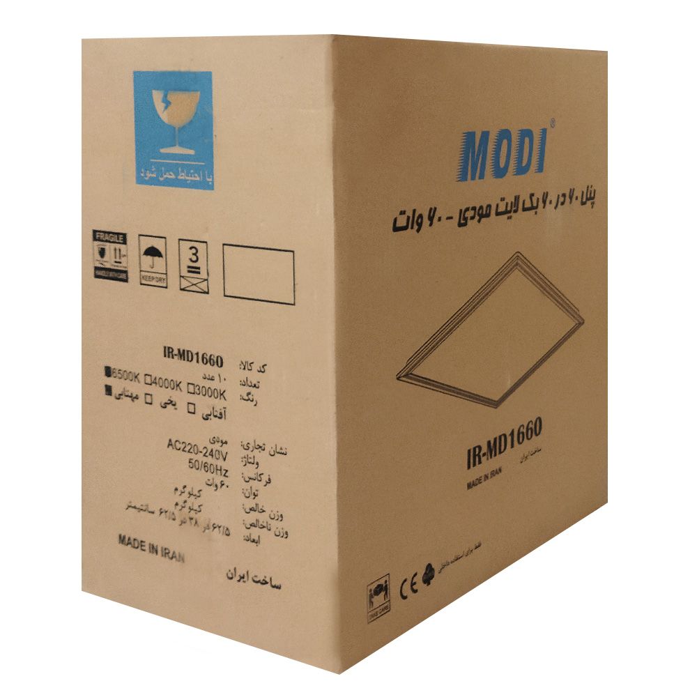 پنل های 120 وات 60 در 60 مودی از چراغ های سقفی بک لایت مودی جهت استفاده عموما در سقف ها می باشد.این پنل ساخت ایران و برند مودی می باشد و دارای 12 ماه ضمانت تعویض می باشد.چراغ های سقفی شصت در شصت رویه مات مودی در وات های 60 ، 80 و 120 وات تولید و عرضه می شود.شاید به جرئت بتوان گفت این پنل 120 وات با حفظ کیفیت خوب ضمن نوردهی بالا از قیمت بسیار مناسب برخوردار است و جزو به صرفه ترین پنل های 60در60 می باشد.نوردهی چراغ ها در سه رنگ نور مهتابی، آفتابی و یخی( استاندارد یا طبیعی) تولید می شوند.جنس بدنه از آلومینیوم با رنگ پودری ساخته شده و دیفیوزر رویی محصول از پلی کربنات با دوام و رنگ سفید مات ساخته شده است.پنل ها مناسب برای سقف های کاذب و قرار گیری در تایل ها می باشد ضمن اینکه قابلیت تبدیل به روکار شدن با استفاده از قاب تبدیل را می باشند.مقدار شار نوری محصول 8400 لومن بوده و نوردهی کاملا پخش با زاویه 120 درجه می باشد.این محصول تنها برای استفاده در فضای داخلی ساخته شده و استاندارد محافظتی در برابر رطوبت را دارا نمیباشد.به دلیل وزن نسبتا سبک نصب این پنل ها بسیار ساده می باشد.